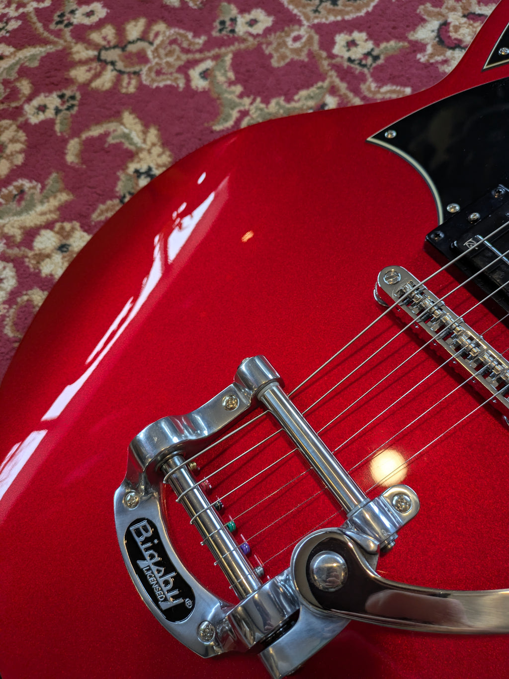 Our Bigsby tremolo system feels great and stays in tune all night long! We install a custom Soft Touch spring into all our Bigsbys for easy, smooth action. Our roller bridge works with our Pin-Lock tuners and Boneite nut to create a system that strings glide through every time.