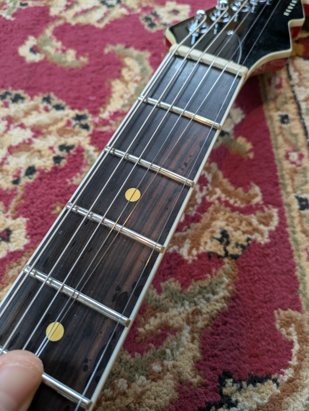 We use "Boneite," a synthetic bone nut, that is more consistent than natural bone, on all Reverend instruments. It reduces friction, allowing the strings to slide through the nut slots smoothly, improving tuning stability.
